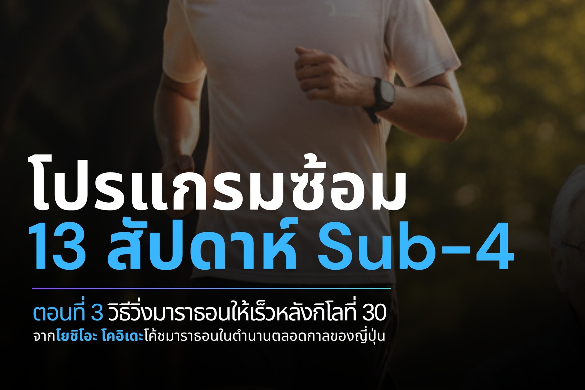เส้นทางสู่ Sub-3 โค้ชโยชิโอะ โคอิเดะบอกว่า คนที่จะตั้งเป้าหมาย Sub-3 คงจะผ่านการวิ่ง Sub-4 มาแล้ว นั่นทำให้มีขาที่แข็งแรง สำหรับการวิ่งมาราธอนแล้ว